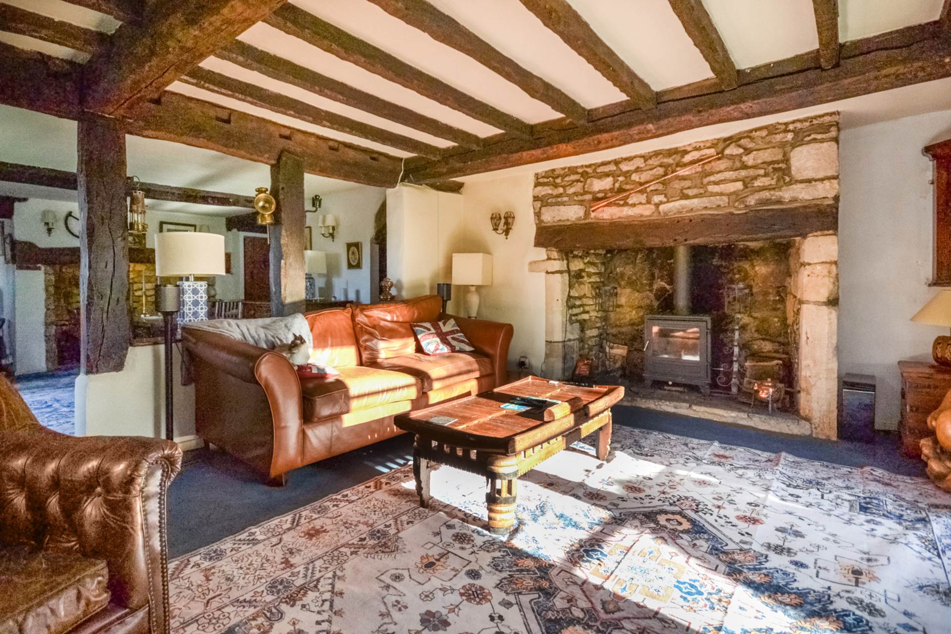 From the dining room, access to the living room is gained. To the head of the room are French doors leading to the rear terrace and garden. To the centre of the room is the properties second inglenook fireplace which within sits a log burning stove, providing a lovely warmth to the room. Windows to the front elevation both in the living room and dining room provide the reception rooms with an abundance of natural light.